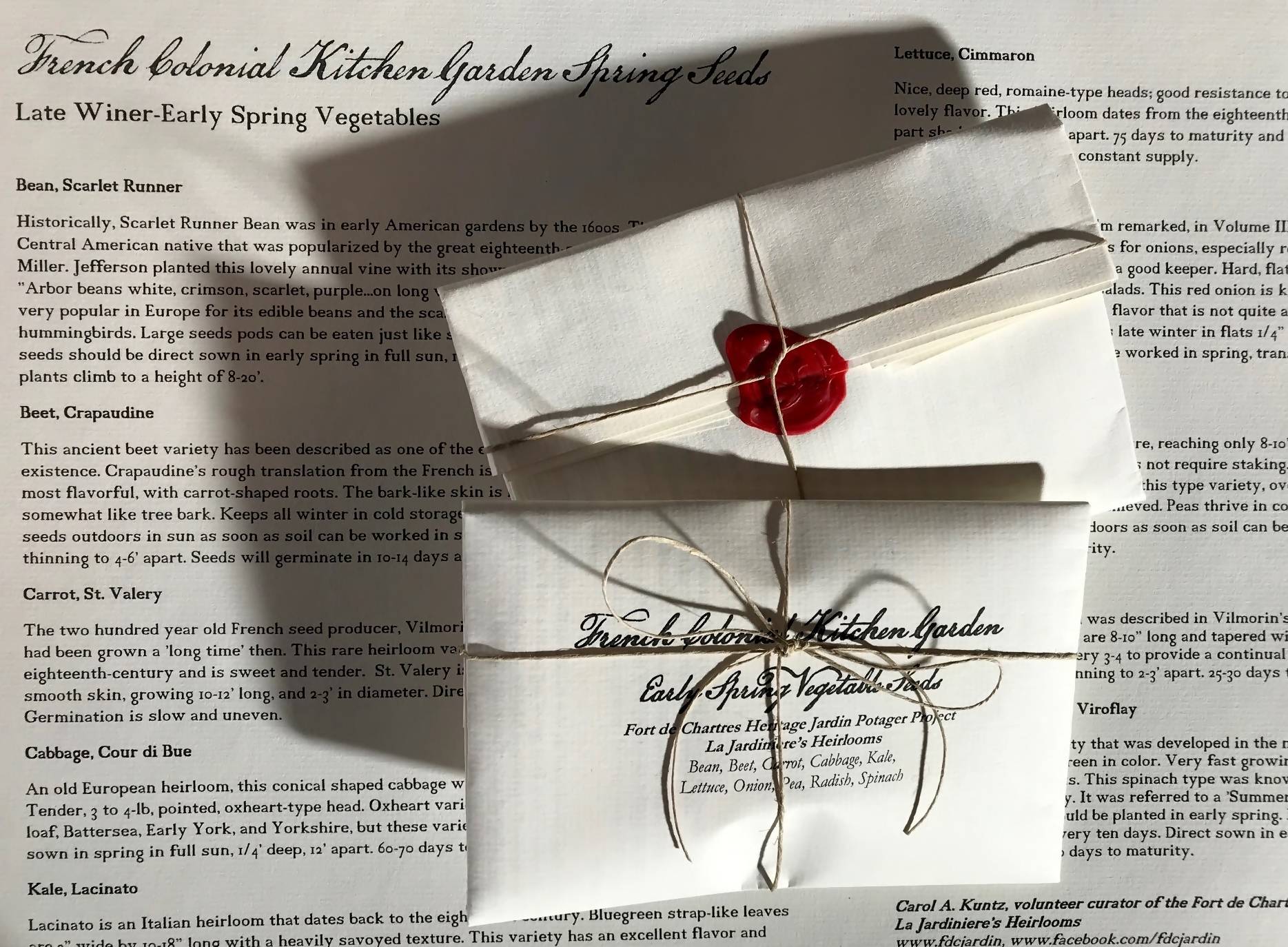 This special heirloom seed packet sampler contains the some of the late winter-early spring vegetables varieties sown in the Fort de Chartres demonstration jardin potager. The sample heritage seed packet collection is packaged in the typical manner of an 18th century letter and sealed with red wax. The package itself opens to detailed information reflecting the history and additional growing details of each variety. Ten individual heirloom sample seed packets are contained in each packet: Scarlet Runner Bean, Crapaudine Beet, St. Valery Carrot, Cour di Bue Cabbage, Lacinato Kale, Cimmaron Lettuce, Red Creole Onion, Tom Thumb Pea, Long Scarlet Radish, Monstrueux De Viroflay Spinach.
