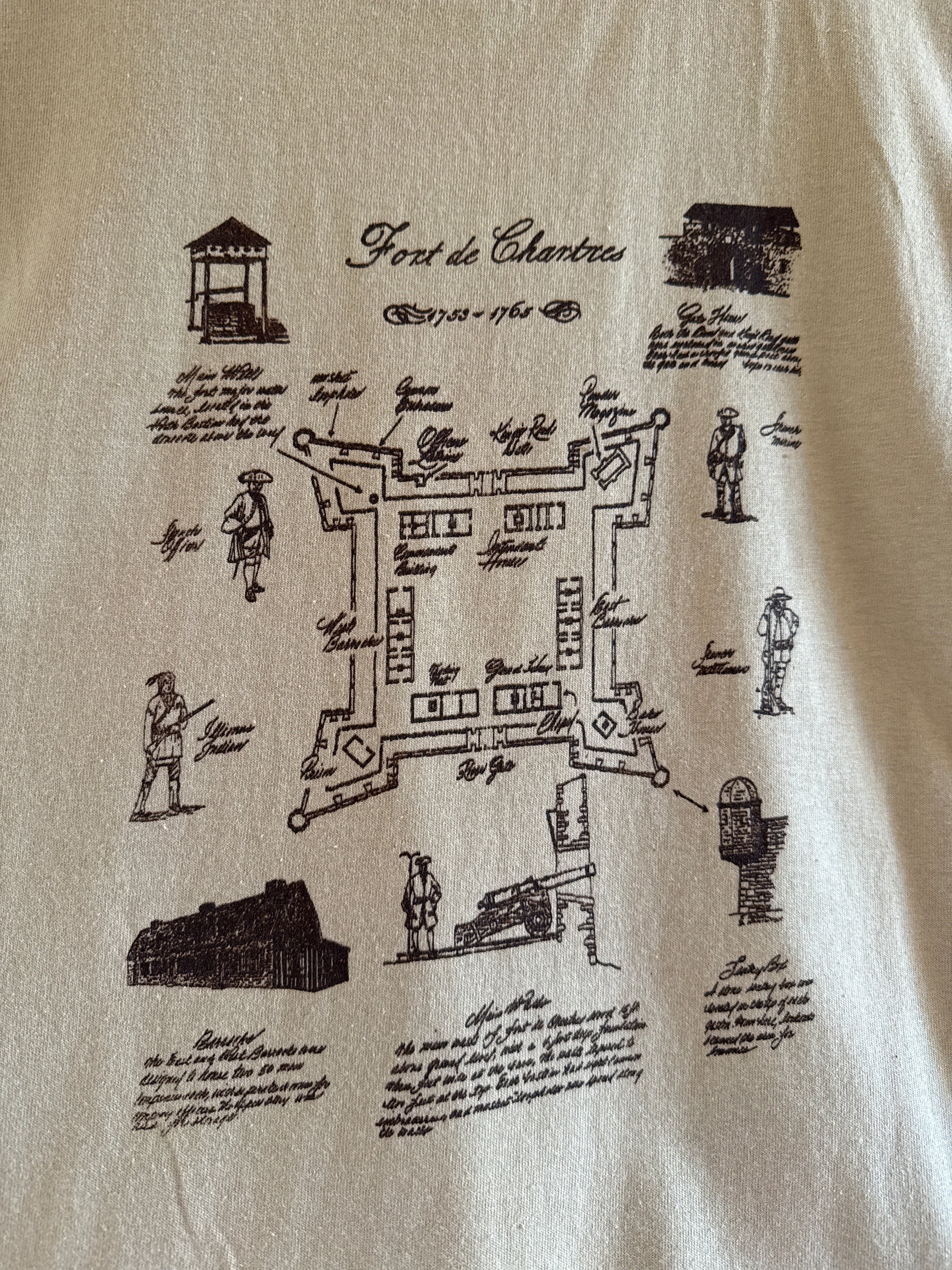 Fort de Chartres Aerial T-shirt This soft tan tee features an intricate aerial perspective of Fort de Chartres, meticulously sketched by artist Ted Mueller. The detailed illustration captures the fort's distinctive layout and architectural features from above, making it a wearable piece of Illinois heritage. Perfect for history enthusiasts and those who appreciate fine artisan design, this shirt celebrates one of the state's most significant colonial landmarks with understated elegance.