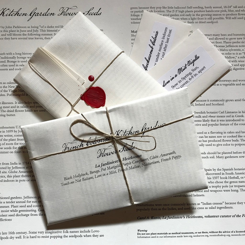 The sample heritage seed packet collection is packaged in the typical manner of an 18th century letter and sealed with red wax. The package itself opens to detailed information reflecting the history and additional growing details of each variety. Ten individual sample seed packets are contained in each collection: Black Hollyhock, Borage, Pot Marigold, Purple Coneflower, Globe Amaranth, Touch me Not Balsam, Love in a Mist (Nigella), French Mallow, Nasturtium, French Poppy.