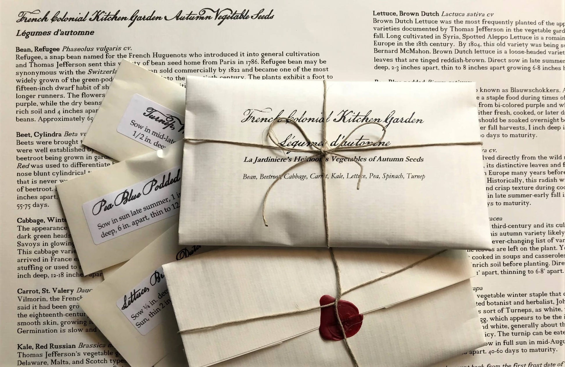 This collection of heritage vegetables suitable for planting for an autumn garden contains seeds of Refugee Bean, Cylindra Beet, Winter King Savoy Cabbage, St. Valery Carrot, Red Russian Kale, Brown Dutch Lettuce, Blue Podded Pea, China Rose Radish, Giant Winter Spinach, and White Egg Turnep. This seed collection reflects the types of fall vegetables that are part of the French Colonial culinary traditions of the Illinois Country and are currently grown in the demonstration garden at Fort de Chartres. These vegetable types were typical to the French Colonial period and thrive in our fall Fort Jardin potager (Zone 6b).